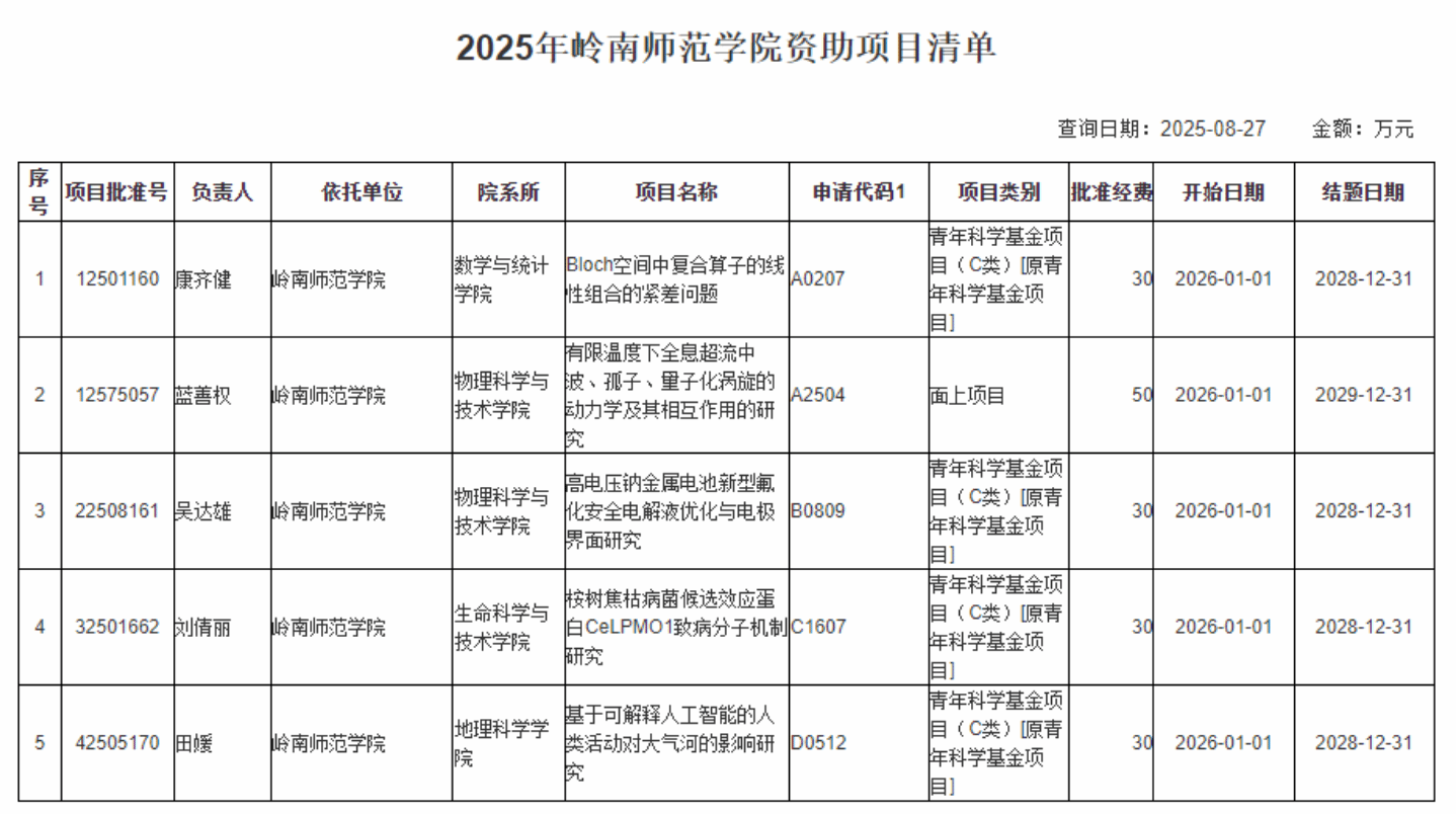 8月27日,2025年国家自然科学基金集中接受申请项目评审结果公布,学校获批资助项目5项,其中包括面上项目1项、青年科学基金项目(C类)4项。立项总数较2024年增加1项,批准经费同比增长近42%。