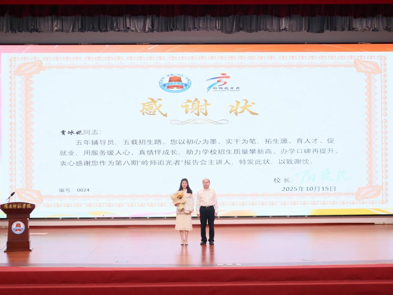 “每个咨询电话背后,都是一个孩子的未来。”贾冰妮握着招生宣传册的手,五年没松过劲。她走遍多所高中、参与数十场招生咨询会,创新“线上+线下”宣传模式,把岭师的专业优势、育人特色送到考生身边。在学校无数个她以及团队的努力下,学校招生“成绩单”逐年亮眼:2025 年招生破万、全省公办本科首位,公费师范生报考热度居高不下。招得进,更要育得好——她主持市厅级课题、指导学生拿下国家级创新奖项,用心陪伴成长,让“招生”与“育人”无缝衔接,拧成推动人才培养质量提升的一股绳。