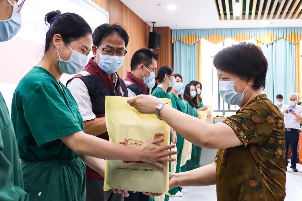 “你们生动诠释了‘最美逆行者’的模样,展现了无私奉献的大爱精神!”兰艳泽代表全校师生向校内外医护人员致以最诚挚的祝福与最衷心的感谢,并为医护人员颁发慰问礼品。指出,本轮湛江市疫情来势汹汹,来自湛江、阳江、茂名的医护人员众志成城、不辞辛劳地奋战在疫情最前沿,累计完成了14万人次的核酸检测,守护3万多名师生员工的健康安全,为学校抗疫工作做出了重要贡献。希望学校全体师生与医护人员团结一致,共同应对突如其来的新冠疫情,共迎抗击疫情的最后胜利。