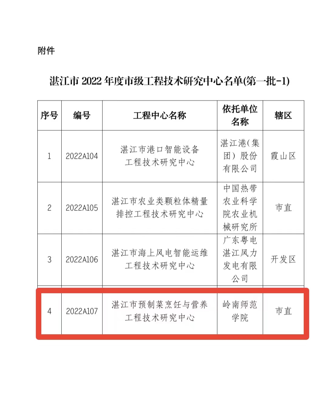 5月16日,湛江市科技局下达2022 年度湛江市工程技术研究中心(第一批-1)认定名单通知,其中依托岭南师范学院建设的“湛江市预制菜烹饪与营养工程技术研究中心”榜上有名,成为湛江市科技局率先通过的四大工程技术研究中心之一。