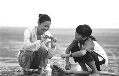 休息时间,林小恋(左)带着学生在海边嬉戏。资料图片