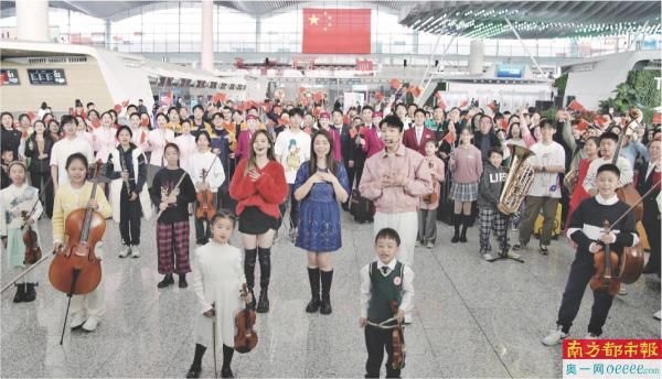 元旦当天,刚投入使用不久的汕头南站装扮一新,迎接旅客的到来。在候车大厅,进站的市民正等待列车到来,出站的旅客商量着去哪里打卡潮汕美食……忽然大厅内响起一阵悠扬的乐曲声,大提琴、琵琶、笛子等优美的旋律响起——“突如其来”的快闪点燃了全场旅客的热情,随着音乐的节奏,青年歌手唱响爱国歌曲《我爱你,中国》,吸引了游客纷纷驻足围观。