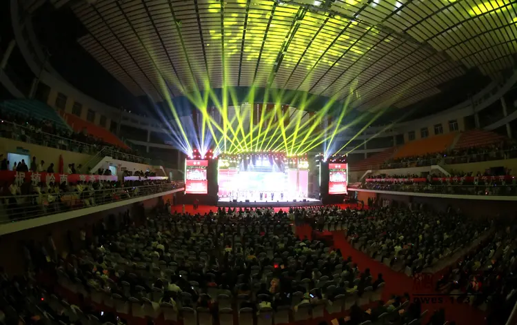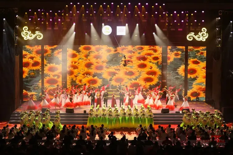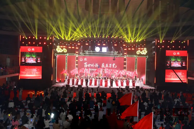 岭师灯光秀,赤诚迎宾朋。晚会现场灯光璀璨,气氛热烈而庄重,以歌舞《鲜花献给您》为序,鲜花与旋律交织 编织百廿师范教育荣光,共贺岭师师范教育120载辉煌。