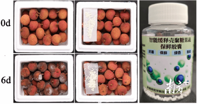 除解决生产端问题外,科研团队聚焦荔枝“鲜度保卫战”。 针对采后易腐难题,学院多学科专家联合攻关18个月,成功研发复合保鲜技术系列产品。该技术融合新型涂膜、功能性网袋包装、保鲜微胶囊缓释及固体保鲜剂,将荔枝常温物流保鲜期从2-3天大幅延长至6-8天,冷链条件下更可达25-30天。这一突破助力廉江荔枝成功打入华北、西北市场,销售半径显著扩大,平均售价提高约15%。