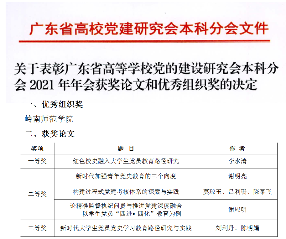 5月16日,据《关于表彰广东省高等学校党的建设研究会本科分会2021年年会获奖论文和优秀组织奖的决定》通知,我校获2021年年会论文“优秀组织奖”,5篇论文分别获一等奖1篇、二等奖3篇、三等奖1篇,获奖篇数名列同类本科院校前茅。