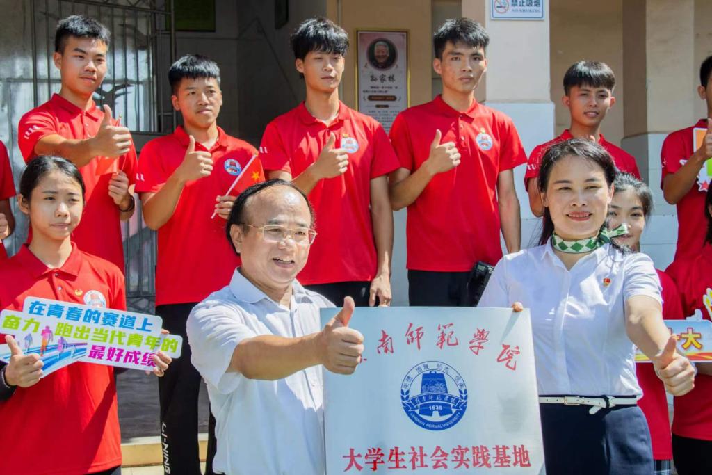 “岭南师范学院的大学生非常认真负责,用心教学,孩子们非常喜欢,学习劲头很足。”湛江市第十九中学校长叶翠玲“点赞”社会实践队,陪同苏古发一行参观了学校的百米校史长廊,从建校82年来的教育变革与成就、劳动教育基地建设、“幸福教育”办学理念等方面介绍了学校基本情况和校园文化建设的亮点,希望未来双方能建立长期、深入、高效的合作关系,共同推进海岛学校基础教育高质量发展。苏古发对市十九中对岭师社会实践工作的大力支持表示感谢,在师生们的共同见证下,将“岭南师范学院大学生社会实践基地”牌匾授予该校,并捐赠一批体育教学用品。