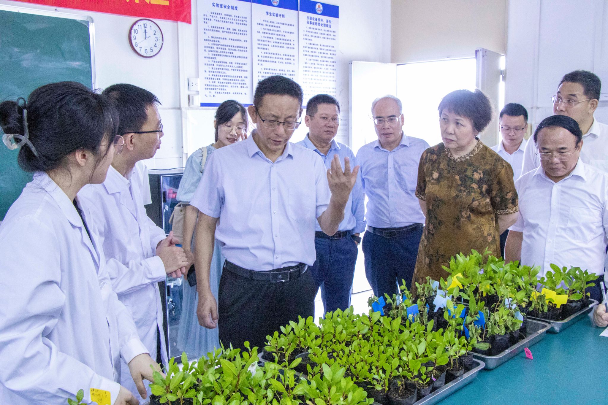 “既要发展科研,又要对接地方需要。有困难可以随时和我们说。”陈峻华慰问了生命科学与技术学院院长、红树林研究院执行院长刘锴栋教授,向其赠送慰问品,对其在热带特色植物资源高效栽培、红树林蓝碳方面做出的贡献表示肯定。在参观了学校生科院生态学实验室和植物栽培室后,陈峻华表示,希望学校在发扬红树林生态恢复及濒危物种研究、红树林蓝碳资源开发及利用、现代农业提质增效、海洋生物养殖优势的同时,能够加强与地方的联系,进一步加强红树林蓝碳资源监测、红树林药食资源开发与利用、热带特色果蔬栽培保鲜加工、海洋渔业等的科技创新,扎实推动“百千万工程”落地见效,助力湛江打造“红树林之城”,加快推动湛江跨越式、高质量发展。