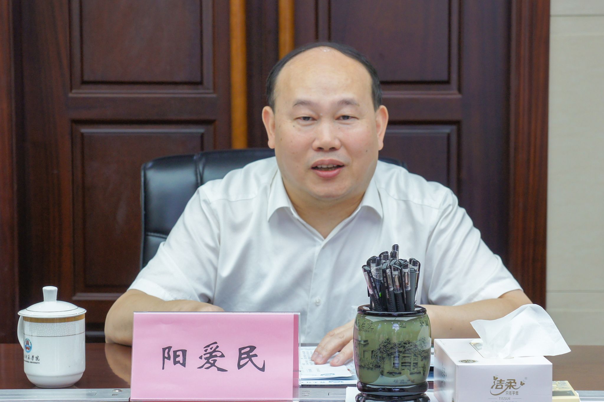 阳爱民对谢冠华一行到来表达了热烈欢迎。他从学校历史、新校区建设、一校三区布局情况、科学研究、教师队伍等方面介绍了学校基本情况。表示岭南师范学院办学层次仍有待突破,需要多向兄弟优秀院校学习,也希望谢冠华书记多多传授经验,促进学校高质量发展。