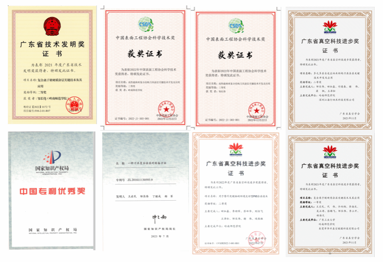 经过多年的建设与发展,中心先进PVD涂层与金属表面改性技术创新团队于2021年被认定为广东省教育厅科研创新团队。获得2021年广东省技术发明二等奖(复合离子镀硬质涂层关键技术及其应用)、2022年度中国表面工程协会科技奖三等奖、2022年度中国国家专利优秀奖以及广东省真空科技进步一、二等奖等奖励。中心主要成员承担了承担国家级科研项目6项,省部级科研项目20多项,在国内外重要学术刊物发表SCI收录学术论文58篇,ESI高被引论文3篇。近三年来申报国家发明专利和实用新型专利40多项,授权30多项,PCT专利2项,专利转化8项,制定及参与行业团体及企业标准10多项。