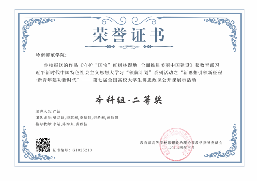 此次培育获奖的作品《守护“国宝”红树林湿地,全面推进美丽中国建设》,由马克思主义学院李靖老师和电子与电气工程学院陈海东、黄秋洁老师指导,由严洁、梁品诗、李苏桐、李培钊、纪希桐、黄伯阳6名同学共同完成。作品从《习近平新时代中国特色社会主义思想概论》课程的学习出发,沿着习近平总书记考察湛江重要足迹,参与建设“红树林之城”的生动实践,感悟习近平生态文明思想的伟力,以行走的思政课引领新时代青年投身美丽中国建设,全面推进人与自然和谐共生的现代化。