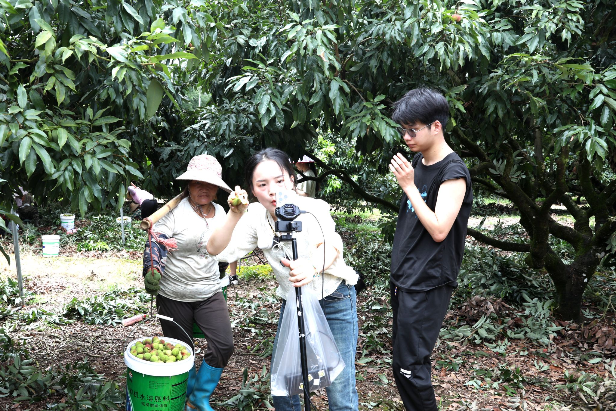 记者看到,一串串青色中带着绯红的荔枝挂满枝头,每一个果子都像是羞涩的少女脸上点缀的胭脂红色,微风的浮动下不停地在向主播点头微笑。主播、助播带着设备边走边介绍,旁边的果农在采摘、运送荔枝,现场一片繁忙景象。