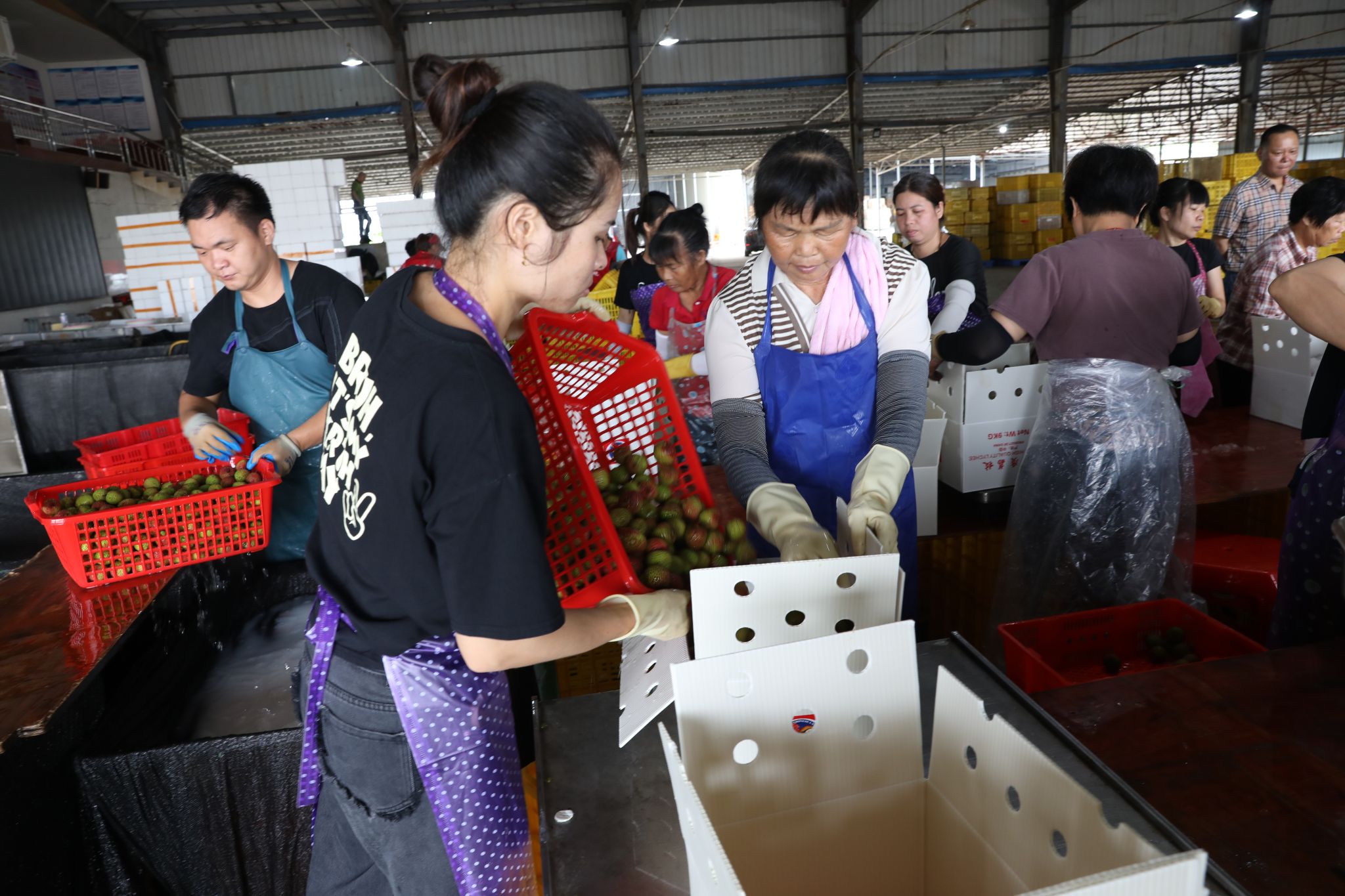 良垌镇是广东省优质荔枝产业大镇,廉江良垌“妃子笑”2020年入选第三批全国名特优新农产品名录,是粤西地区最大的妃子笑生产基地和出口基地。在日升荔枝合作社生产车间,车间工人正忙着进行荔枝的挑拣、装箱、加冰打包,一箱箱打包好的“妃子笑”很快将发往全国各地。