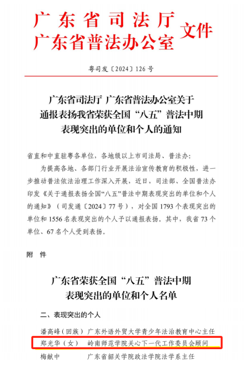 近日,广东省司法厅、广东省普法办公室印发《关于通报表扬我省荣获全国“八五”普法中期表现突出的单位和个人的通知》(粤司发〔2024〕126 号),通报表扬广东省获得全国“八五”普法中期表现突出的单位和个人。其中,学校规划与法规处选送的郑光华老师荣获全国“八五”普法中期表现突出个人,广东省教育系统仅3人获此殊荣。