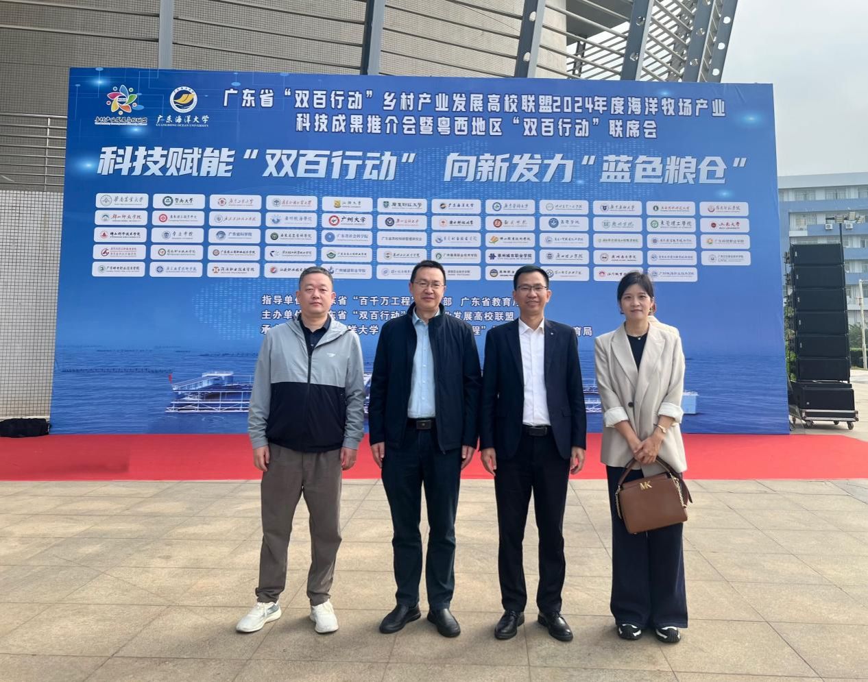 12月10日,广东省“双百行动”乡村产业发展高校联盟2024年度海洋牧场产业科技成果推介会暨粤西地区“双百行动”联席会在广东海洋大学举办。广东省科技厅、湛江市相关部门领导,省乡村产业发展高校联盟成员单位、各县区“双百行动”专班负责人、企业代表参加会议,共同推动优秀科研成果就地转化,汇聚科技力量助推“百千万工程”,为乡村产业高质量发展贡献智慧和力量。学校副校长金义富、生科院院长刘锴栋、生科院海洋资源开发技术系主任杨长庚、生科院海洋资源开发技术系专任教师谢瑞红参加会议。