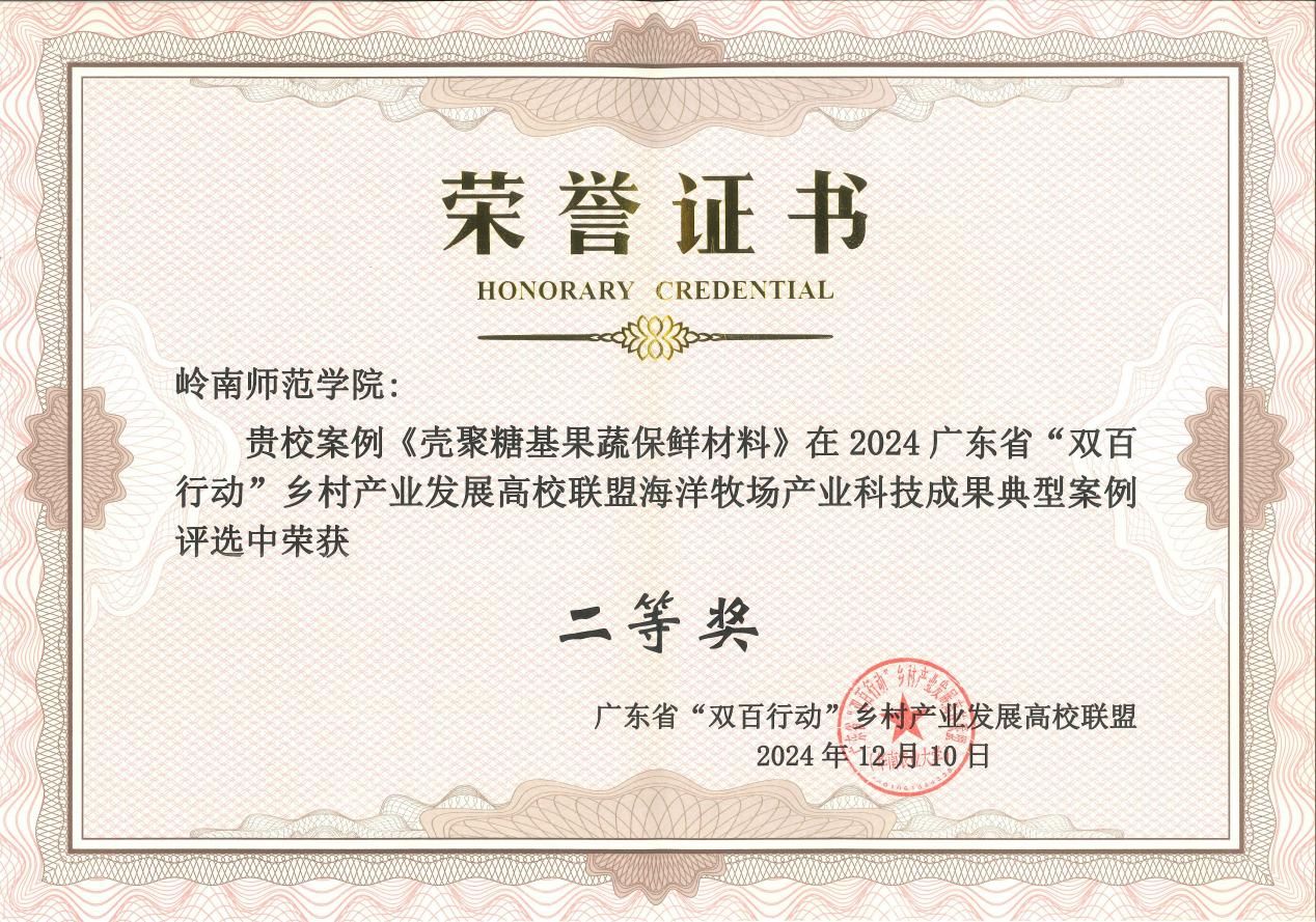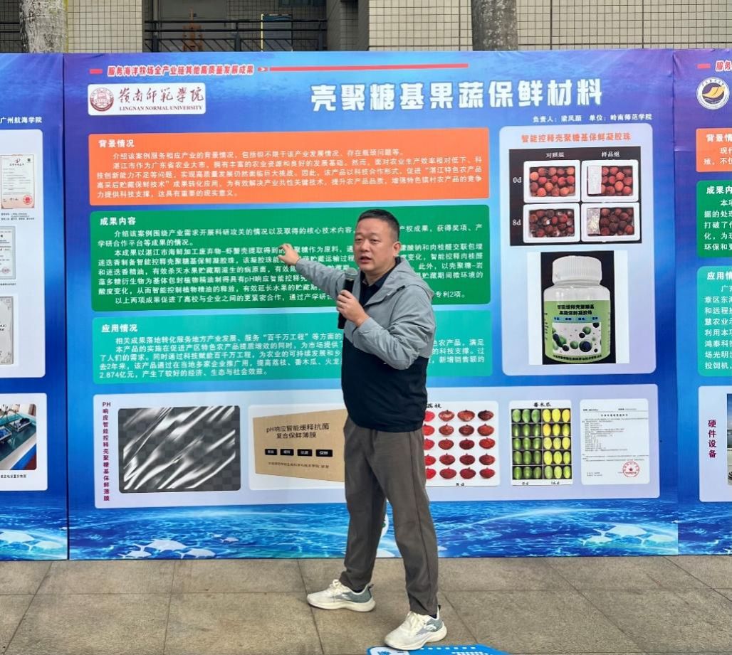 会上发布了一批2024年乡村产业发展高校联盟“培育海洋新质生产力 推动海洋牧场全产业链创新”典型案例,并以“展板+解说”的形式集中展示了联盟服务海洋牧场产业发展的标志性成果。生科院海洋资源开发技术系专任教师梁凤颜团队的《壳聚糖基果蔬保鲜材料》荣获海洋牧场产业科技成果典型案例二等奖。