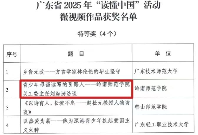 2025年“读懂中国”活动微视频作品《青少年母语读写的引路人——岭南师范学院关工委主任刘海涛访谈》获教育部关工委最佳微视频奖、省教育系统关工委微视频特等奖
