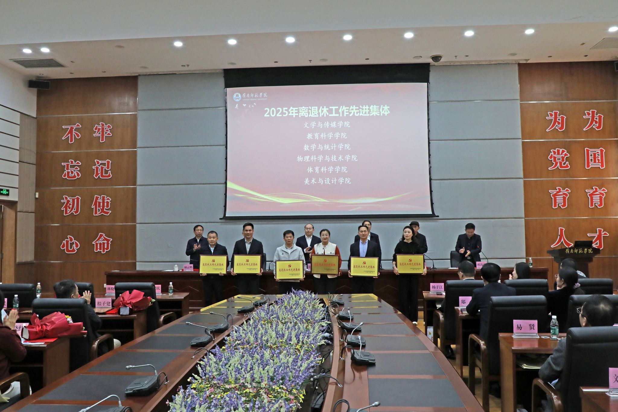 会议还为2025年退休的教职工举办了荣休仪式,表彰了2025离退休工作先进集体和先进个人、2025年“读懂中国”活动获奖单位及个人。阳爱民向荣休教职工代表颁发了荣休感谢状并献上鲜花,为5名“老有所为”先进个人,以及在“读懂中国”活动中荣获国奖的集体与个人颁奖,表彰他们为学校发展和关心下一代工作做出的突出贡献。