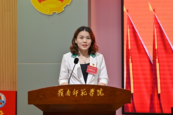 陈媛媛同学代表岭南师范学院第三届学生联合会作工作报告(梁家彬摄)