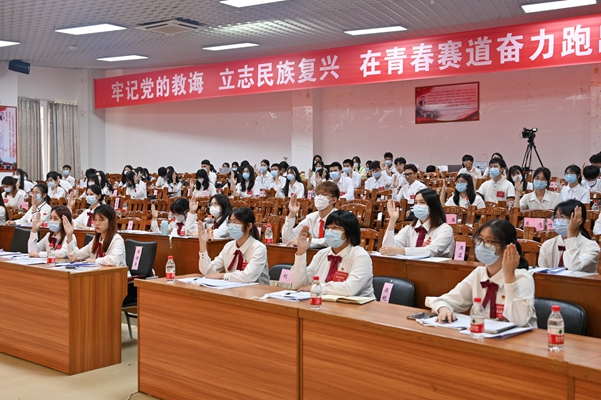 大会强调,要更加紧密地团结在以习近平同志为核心的党中央周围,高举习近平新时代中国特色社会主义思想伟大旗帜,在推进学校高质量发展、实现中华民族伟大复兴中国梦的新长征路上奋勇搏击,勇毅前行,在青春的赛道上奋力奔跑,以优异青春业绩迎接党的二十大胜利召开!