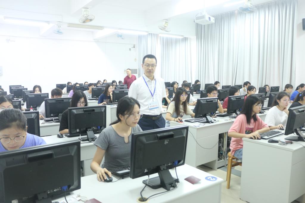 学校副校长金义富在综合楼的计算机考场进行巡考