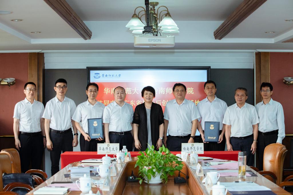 随后,双方签订了《华南师范大学与岭南师范学院关于共同申报广东省博士后创新实践基地合作协议书》。
