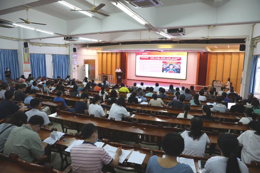 岭师新闻中心讯:6月29日下午,校长阳爱民在教三211课室以《汲取智慧和精神力量,努力推动学校高质量发展——贯彻落实省第十三次党代会精神》为题,向文学与传媒学院和生命科学与技术学院全体教职工集中宣讲省第十三次党代会精神,希望全校师生从省第十三次党代会精神中汲取智慧和力量,踔厉奋发,推动学校高质量发展。