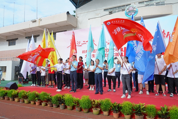 “希望广大青年学子不忘初心,牢记使命,不负韶华,不负时代,在青春的赛道上奋力奔跑,努力跑出岭师学子最靓丽的风采!”学校党委副书记黄达海、副校长苏古发率大学生社会实践领导小组成员为“三下乡”社会实践队伍授旗。黄达海勉励参加社会实践的青年学子要厚植家国情怀,坚定理想信念,在社会实践中把实现个人理想和祖国的发展目标有机结合起来;要投奔伟大实践,磨练意志品质,在实践中受教育、长才干、增本领;要严守组织纪律,筑牢安全底线,平安出征,平安归来。在现场师生热切的期盼中,一声慷慨激昂的“出征!”把现场气氛推向高潮,彩旗飘扬,掌声热烈。