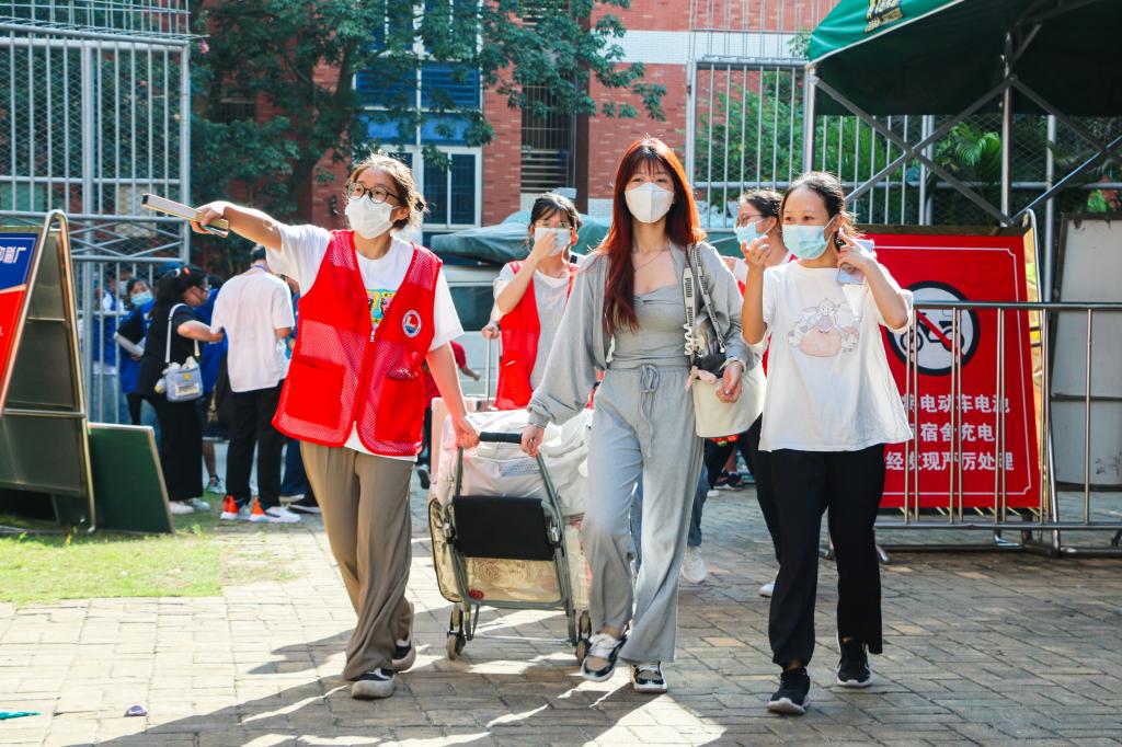 迎新现场,志愿者帮着新生搬运行李(廖雯诗摄)