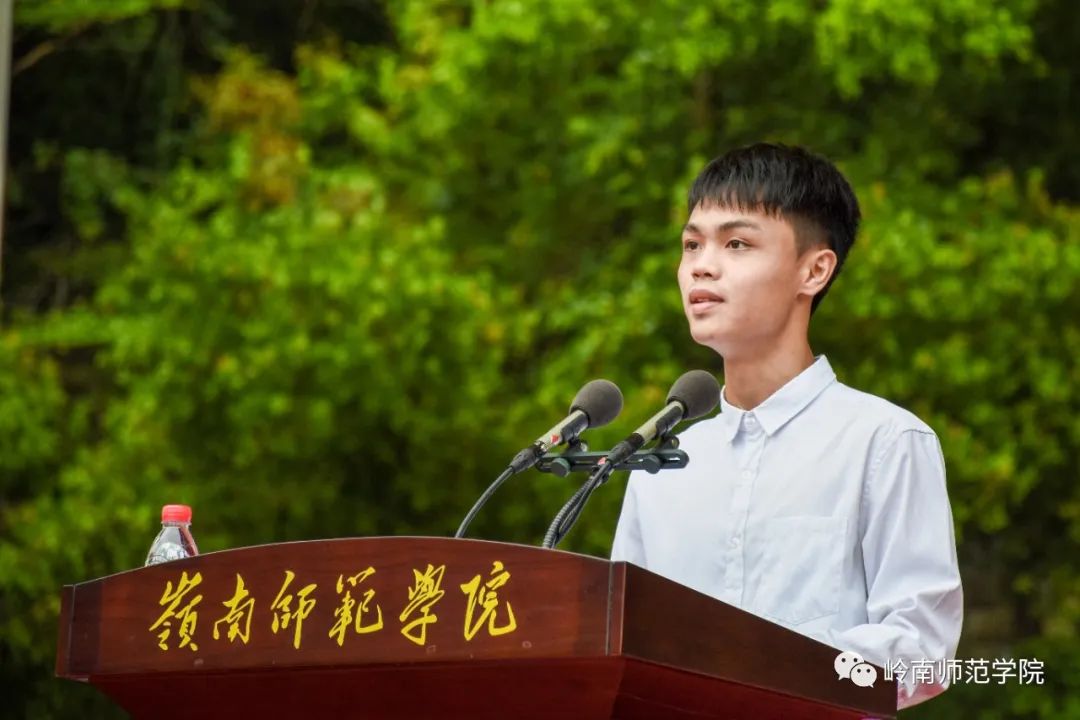 “铭记岭师校训,传承雷阳文脉,弘扬师道精神,厚植家国情怀……为国家富强民族复兴努力奋斗!”典礼上,全体新生握起右拳,面对校旗集体庄严宣誓。铿锵有力的誓言,振奋人心的誓词,在雷阳广场响彻云霄。