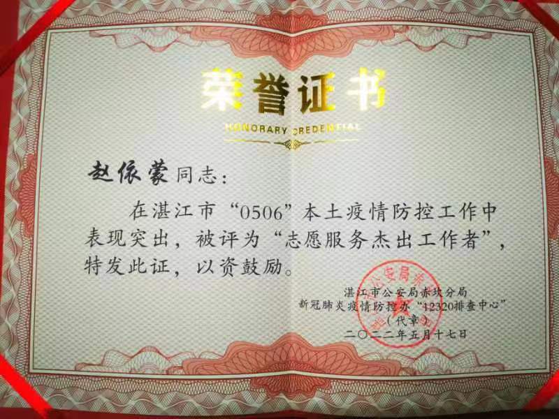 春未尽,夏初临,突如其来的疫情肆虐,牵动着所有人的心。疫情当下,外国语学院19级英语8班的赵依蒙荣获湛江市公安局颁发的“志愿服务杰出工作者”的称号,在湛江市“0506”本土疫情防控工作中,她逆行而上,毅勇投身于疫情防控工作,战斗在“疫”线,为湛江奉献出自己的青春热血,彰显了青年担当。