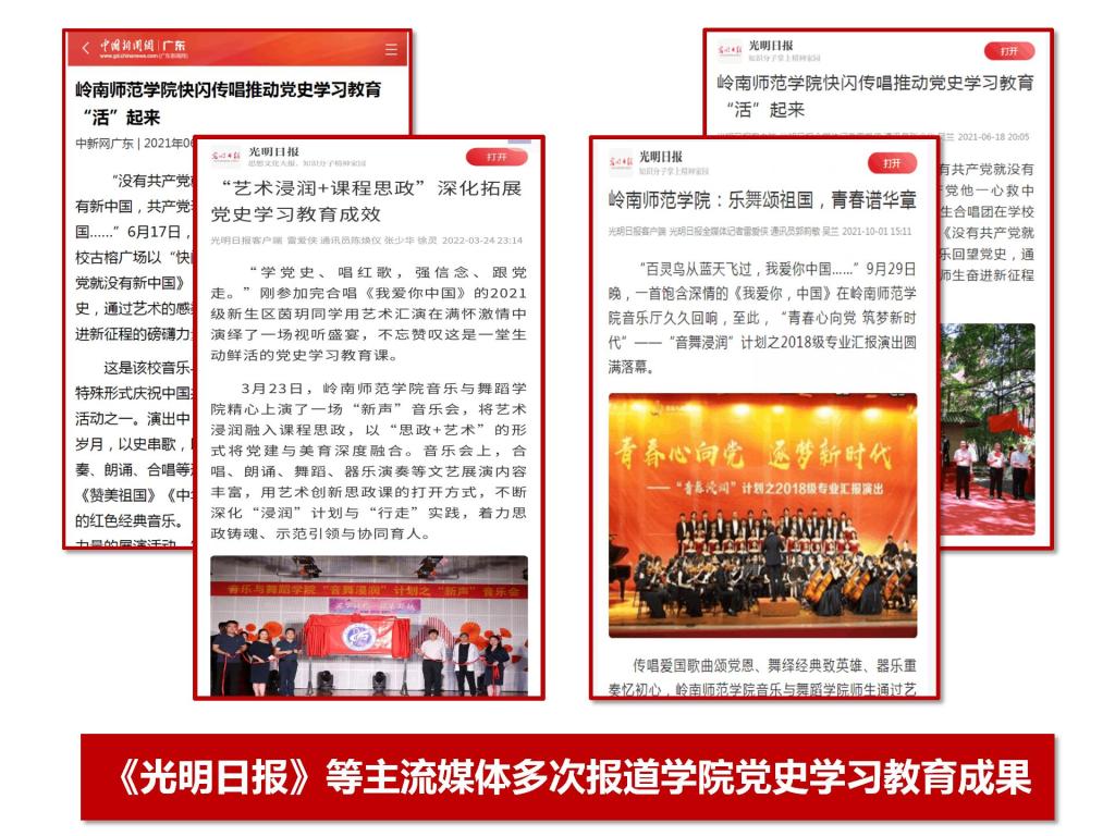学院党委《基于内涵式发展的“四维协同”党建育人新路径—音乐与舞蹈学院党建育人品牌建设的探索与实践》以参评单位第二名的成绩荣获学校2021年度基层党建经验与成果评选二等奖;郑晓辉主持的《“五维融合”学党史,奏响奋进最强音》获得省委教育工委“党史进校园系列活动”典型案例二等奖。光明日报、中新网、南方+、广州日报等主流媒体多次报道学院党建特色品牌活动。