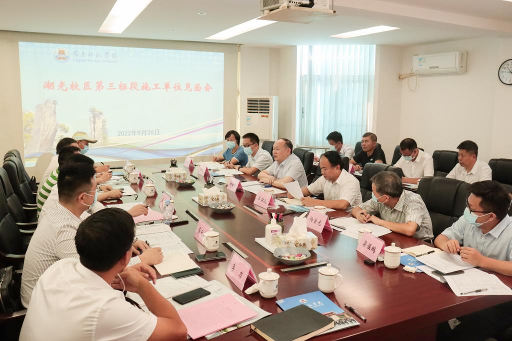 岭师新闻中心讯:9月20日上午,学校在二号会议室召开湖光校区第三标段施工单位见面会。学校校长阳爱民出席会议,副校长苏古发主持会议。